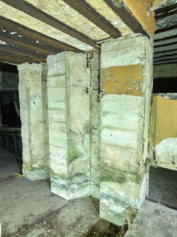 Vue de l'entrée de la salle des machines (groupe électrogène) depuis l'extérieur. Elle était prévue pour être condamnée par des poutres métalliques après installation des équipementsImmatriculation