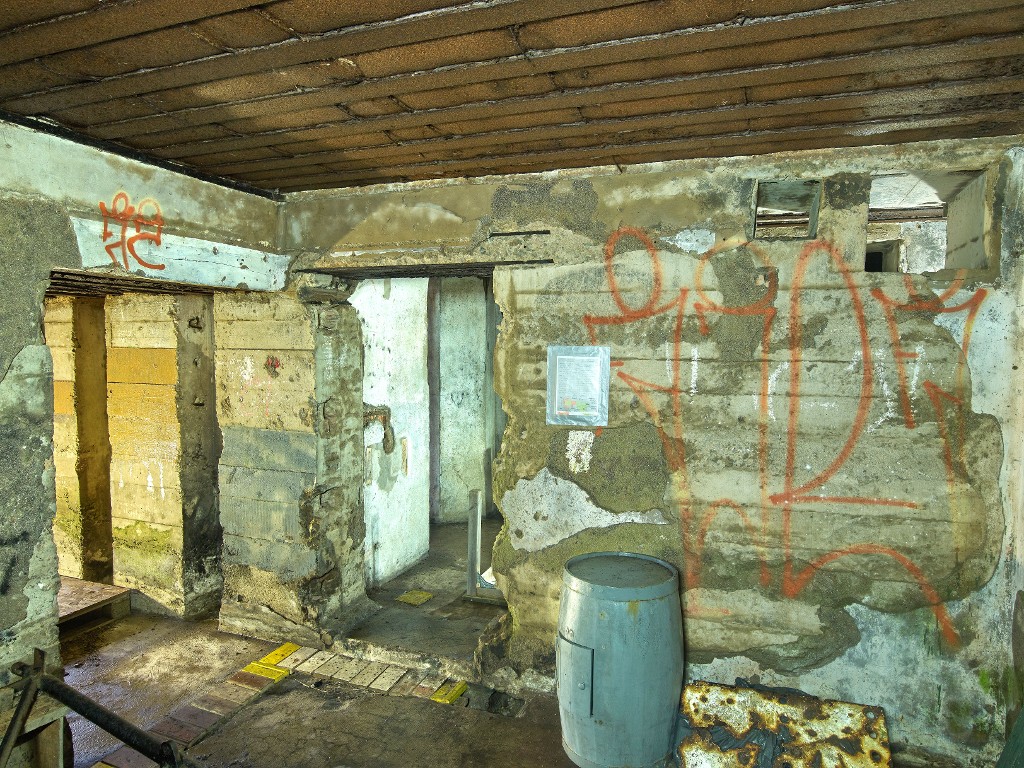 Vue de la salle des machines (groupe électrogène). A gauche : entrée pour le matériel ; au centre, accès vers le couloir d'entrée. Cette partie du bunker n'est pas étanche aux attaques de gazImmatriculation