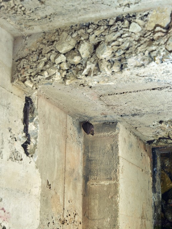 Vue de la salle des ventilateurs, sortie de secours (mur nord-est). Un Grand rhinolophe (chauve-souris) - en hibernation durant l'hiver - y a élu domicileImmatriculation