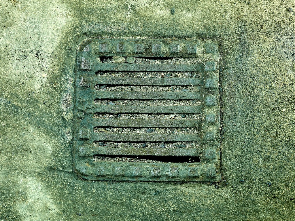 Vue de la salle des ventilateurs, grille de l'exutoire aménagé dans le sol pour le nettoyageImmatriculation