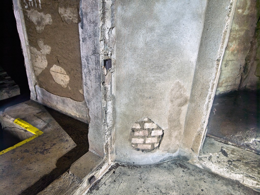Vue du passage des câbles de la salle des compensateurs au puits d'antenne sud-ouest via un sas étanche. Ils sont photographiés depuis le sas doublé en brique montée au ciment. Les portes ont disparuImmatriculation