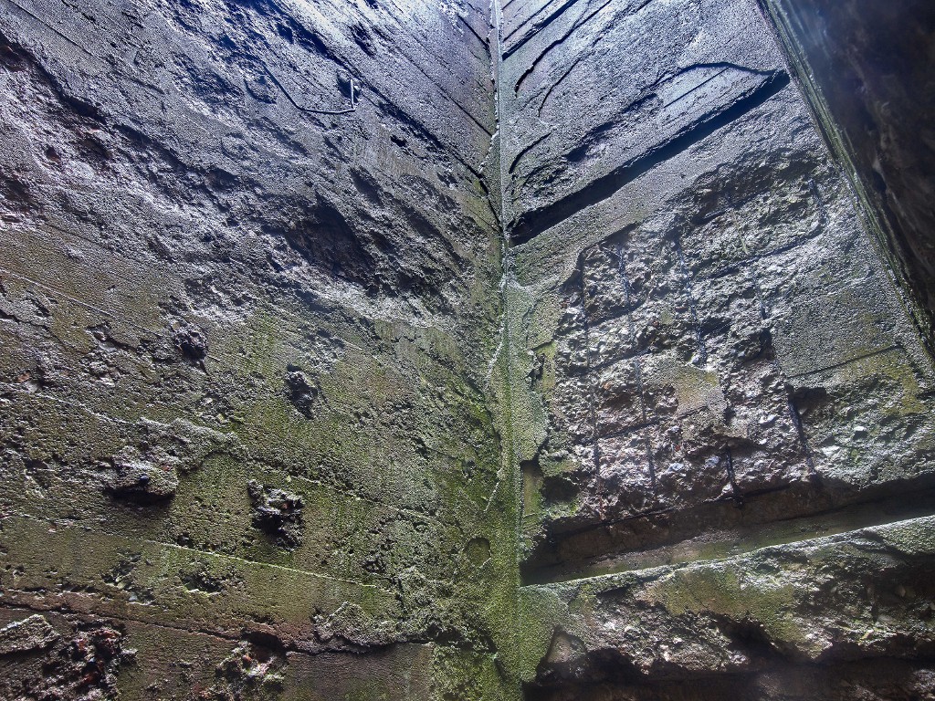 Vue du puits d'antenne sud-ouest. Les murs étaient dotés de tasseaux posés à intervale régulier pour la fixation des câbles. Le béton laisse apparaître gravillons, galets entiers et ferraillageImmatriculation