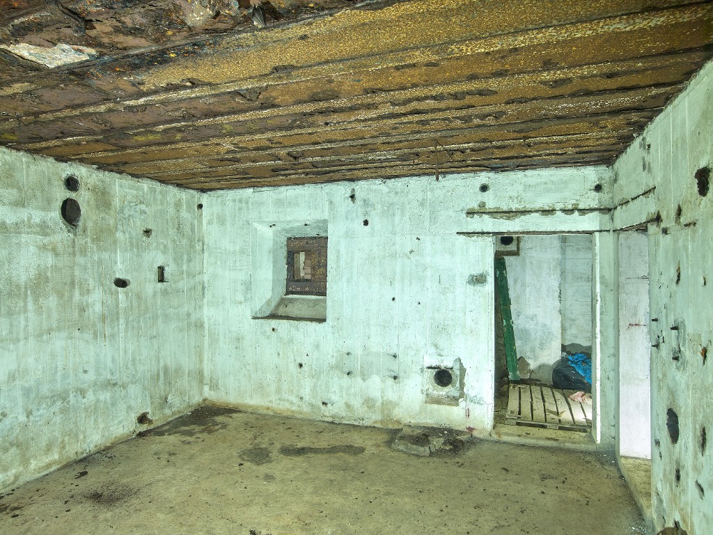 Vue de la salle de garde nord. Au centre, créneau blindé défendant l'entrée nord. A droite, portes communiquant avec le sas étanche et la salle de garde sud. Les murs sont peints en blancImmatriculation