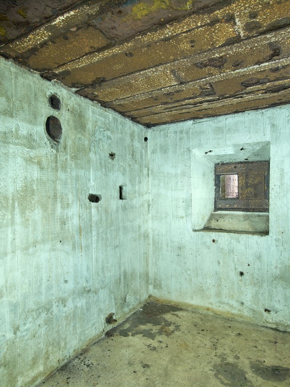 Vue de la salle de garde nord, créneau blindé défendant l'entrée nord. A droite, en haut, conduites du poêle. Dans l'angle se trouve un tube acoustique communiquant avec le poste d'observation extérieurImmatriculation