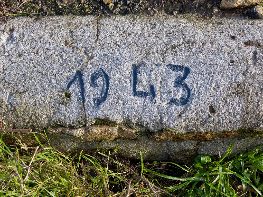 Vue de la tranchée d'accès. Plusieurs millésimes ou empreintes sont visibles : ici, 1943 (mur de soutènement)Immatriculation