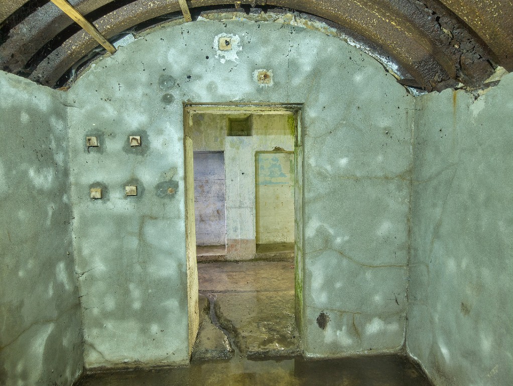 Vue de l'entrée de la salle de garde (couverte en tôle ondulée cintrée dite tôle métro). Le bunker a ultérieurement été transformé en logement (les murs ont été doublés en brique et enduit au ciment)Immatriculation