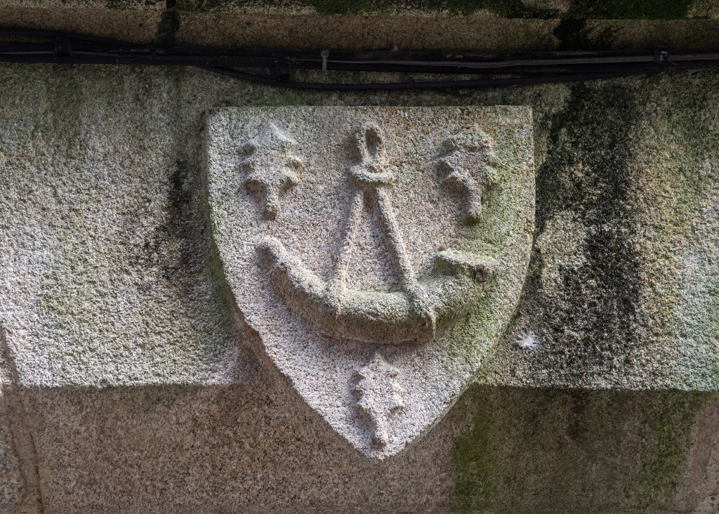 Ecusson sculpté d'un olifant et de trois feuilles de houx.Immatriculation