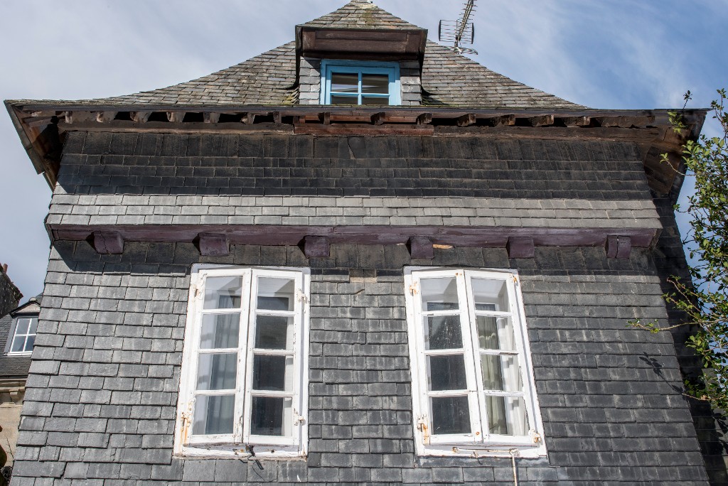 L'essentage d'ardoise recouvre l'étage et le surcroît, cachant un pan de bois.Immatriculation
