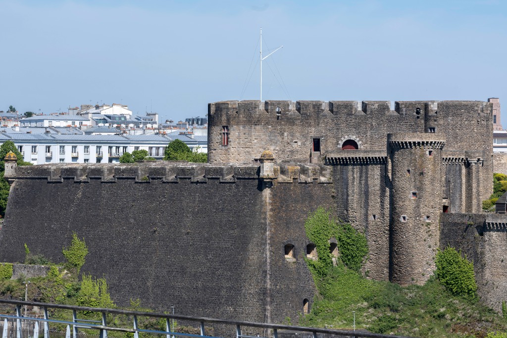 Vue du bastion de Sourdéac et du donjon (tour Azénor, tour du Donjon et tour de la Duchesse Anne) depuis le Jardin des ExplorateursImmatriculation