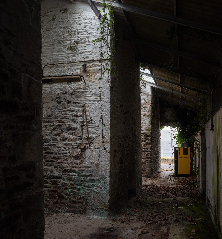 Vue intérieure de l'atelier B23 : espace ouest couvert en appentis vers le sud (état en 2025). Au sol, subsiste une voie ferrée étroite. A gauche, l'alvéole n° 2. L'alvéole était dotée d'un entresol reposant sur des poutrellesImmatriculation
