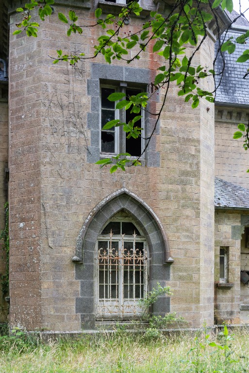 Vue de détail du château de Kerhuon : élévation sud-est, fenêtre en arc brisé de style néo-médiéval (état en 2025)Immatriculation