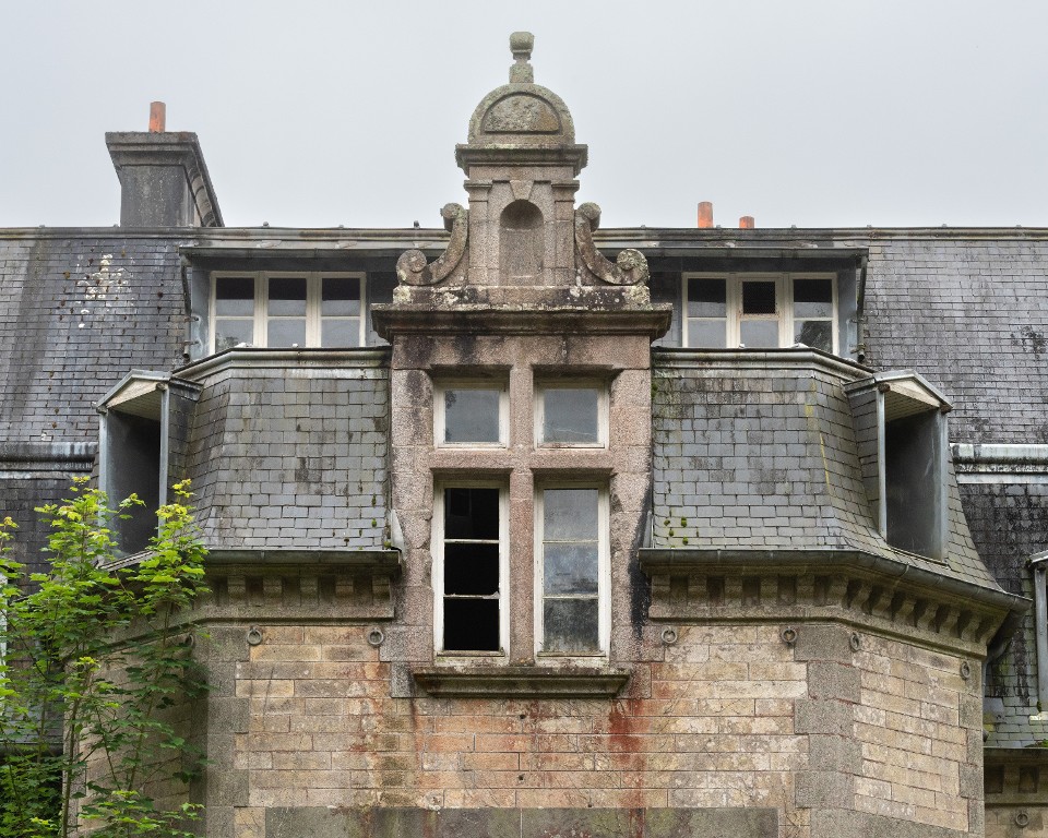 Vue de détail du château de Kerhuon : élévation principale nord-est, lucarne centrale de style Renaissance (état en 2025)Immatriculation