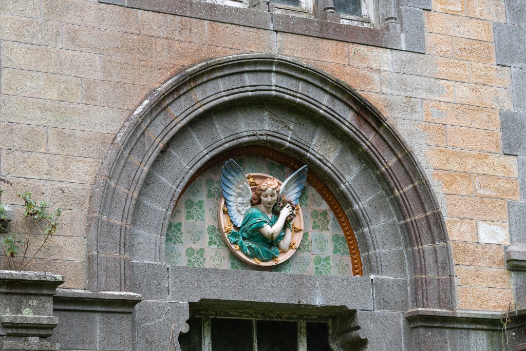 Vue de détail du château de Kerhuon : élévation nord-ouest, tympan de la porte (état en 2025). Il est orné d'un ange aux ailes déployées tenant dans ses mains des fleurs sur un fond de carreaux à décor floral et héraldiqueImmatriculation