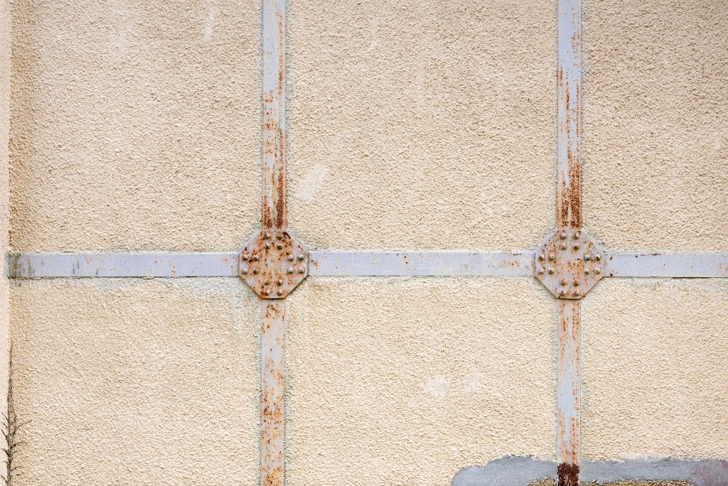 Vue de détail du bâtiment E22 : élévation nord, plaques de ciment armé et poutrelles assemblées par des plaques rivetées (état en 2025)Immatriculation