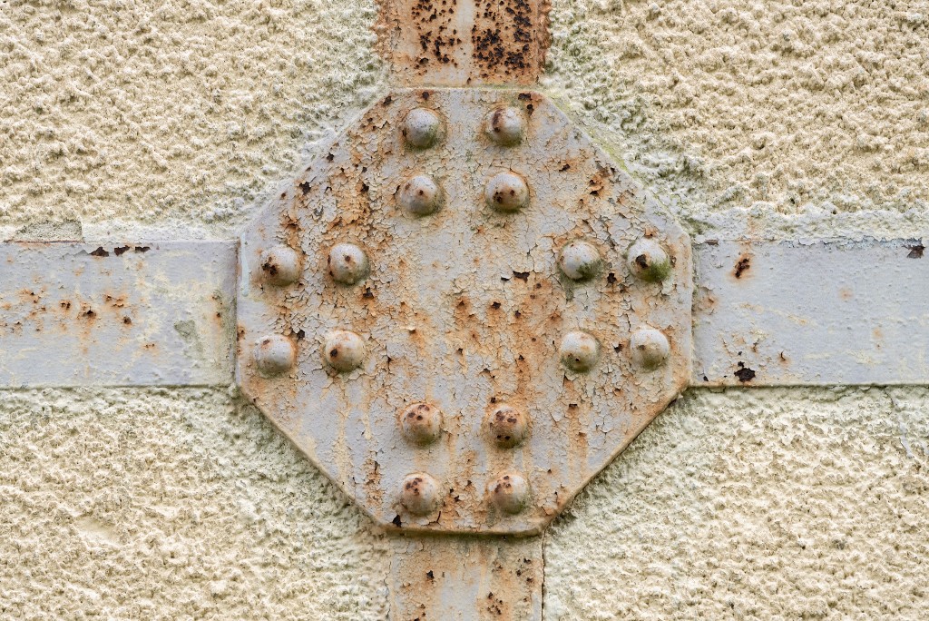 Vue de détail du bâtiment E22 : élévation nord, plaques de ciment armé et poutrelles assemblées par des plaques rivetées (état en 2025)Immatriculation