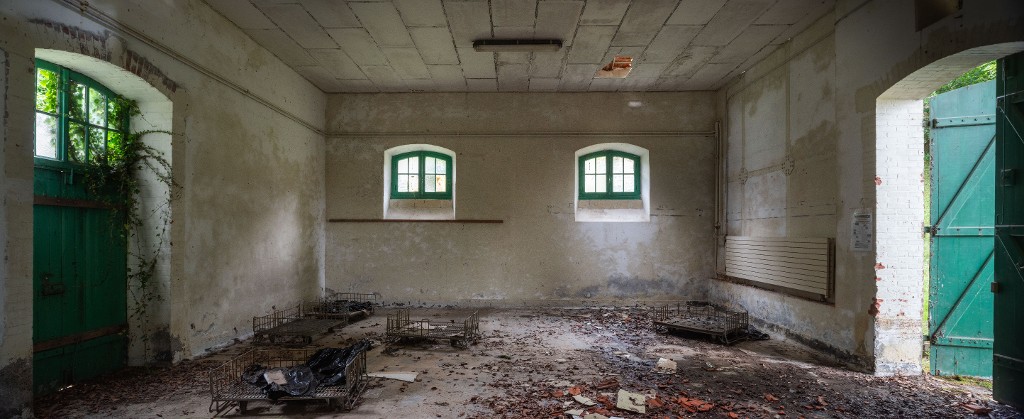 Vue intérieure du bâtiment E22 : portes nord et sud (état en 2025). Au fond, mur ouest. Sur le mur nord, un grand radiateurImmatriculation