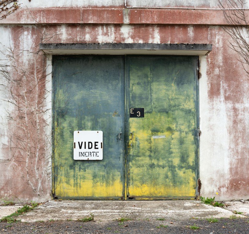 Vue de détail du bâtiment E3 : élévation est, porte à double battant métallique (état en 2025). Le bâtiment E3 est couvert en tôle ondulée en fibrocimentImmatriculation