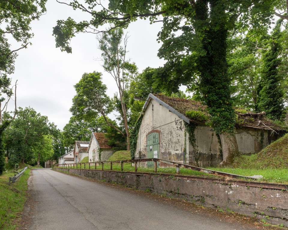 Vue des bâtiments E5, E4 et E3 depuis le nord-nord-est (état en 2025). Ils sont séparés par des merlons de terreImmatriculation