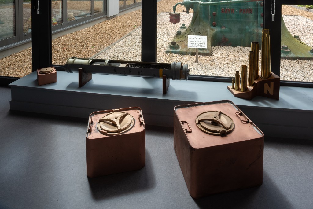Vue générale des collections patrimoniales présentées dans le hall du Pôle direction et administration (état en 2025). Au premier plan, caisses de transport de poudreImmatriculation