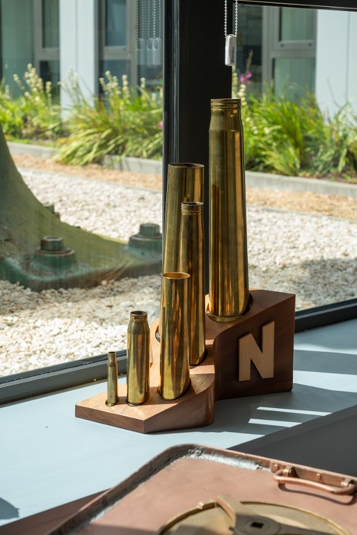 Vue des collections patrimoniales présentées dans le hall du Pôle direction et administration : douilles de différents calibres sur leur présentoir orné des lettres S et N pour Saint-Nicolas (état en 2025)Immatriculation