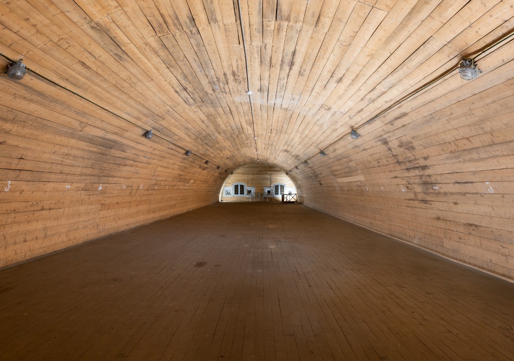 Vue intérieure de la poudrière n° 3 (P3) de la vallée de Kerhuon : premier étage vers le nord (état en 2025). La voûte est entièrement lambrissée. En arrière-plan : fenêtres et créneaux à lampe ; à droite, l'escalierImmatriculation
