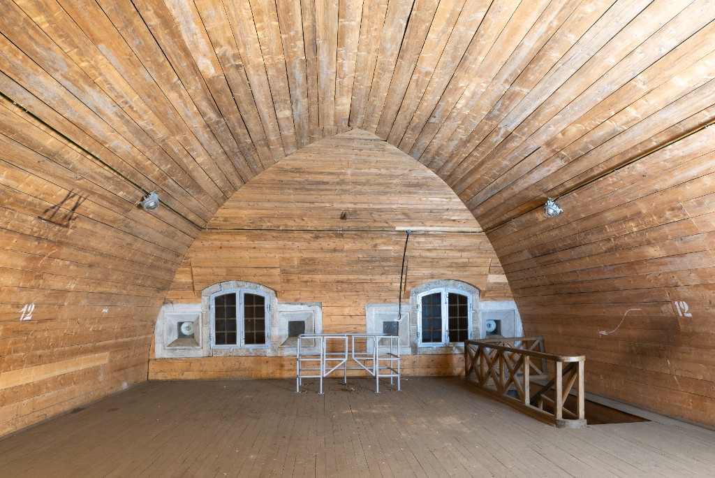 Vue intérieure de la poudrière n° 3 (P3) de la vallée de Kerhuon : premier étage, extrémité nord, emplacement du palan permettant les manutentions par une trappe aménagée dans le plancher (état en 2025). En arrière-plan : fenêtres et créneaux à lampeImmatriculation