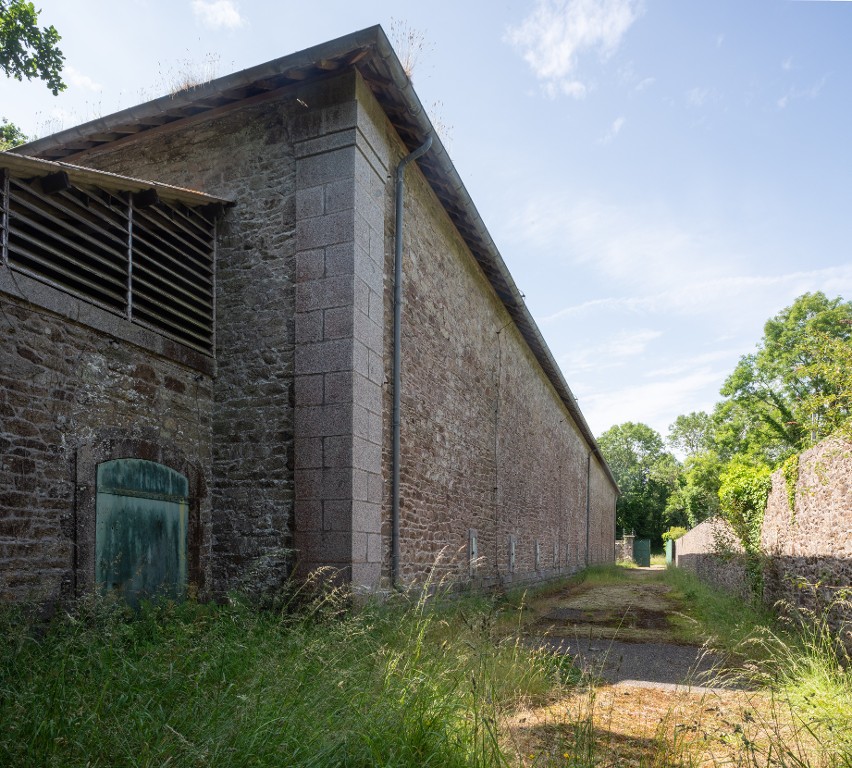 Vue de la poudrière n° 3 (P3) de la vallée de Kerhuon depuis le nord-est : élévation ouest (état en 2025). Le magasin est entouré d'une enceinte de sûreté en maçonnerie. Les chaînes d'angle sont en pierre de taille de granite grisImmatriculation