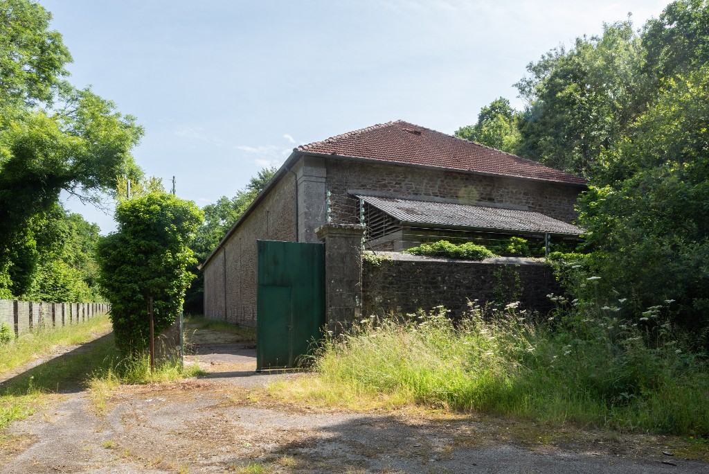 Vue générale de la poudrière n° 3 (P3) de la vallée de Kerhuon depuis le sud-ouest (état en 2025). Le magasin est entouré d'une enceinte de sûreté en maçonnerie percée d'un portail ; il est couvert en tuile plateImmatriculation