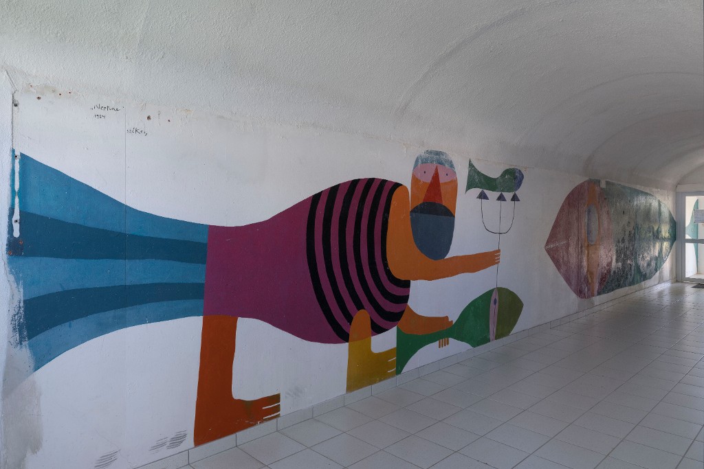 Fresque "Neptune" (1984) par Dominique Lassalle (épouse Székely) dans le couloir des logements pour jeunes ménages.Immatriculation