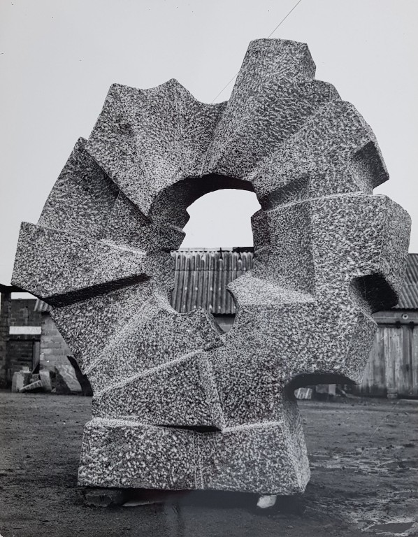 "Soleil", sculpture en granite rose de Simone Boisecq. Vue rise en 1977, avant installation.Immatriculation