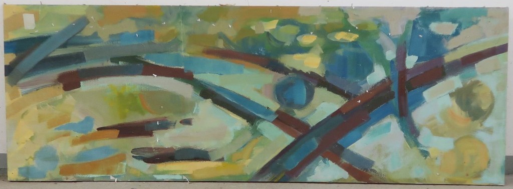 Jean-Claude Carsuzan, "Les saisons" peinture murale sur panneau de bois, 1969. Vue d'ensemble du panneau 2/4 de l'une des deux parties.Immatriculation