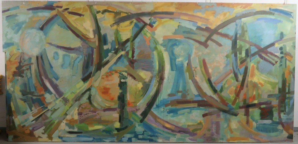 Jean-Claude Carsuzan, "Les saisons" peinture murale sur panneau de bois, 1969. Vue d'ensemble du panneau 3/4 de l'une des deux parties.Immatriculation