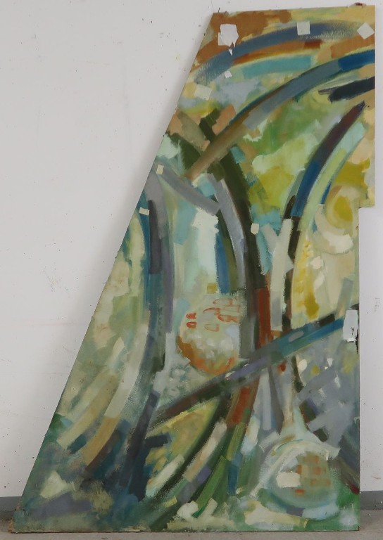 Jean-Claude Carsuzan, "Les saisons" peinture murale sur panneau de bois, 1969. Vue d'ensemble du panneau 1/4 de l'une des deux parties.Immatriculation
