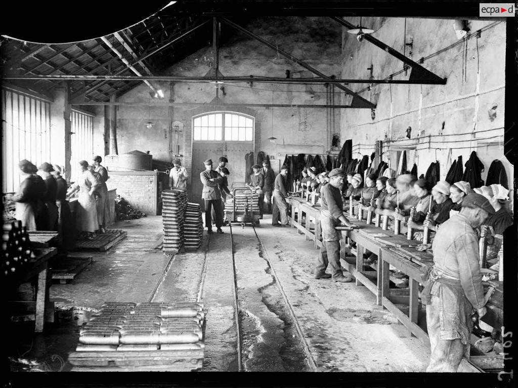 Vue intérieure d'un atelier en 1916 : à gauche, lavage des obus de 75 mm ; à droite, nettoyage intérieur des obus. L'équipe est mixte. Cet atelier à charpente métallique avec fenêtre de type verrière est traversé par une deux voies ferrées étroitesImmatriculation