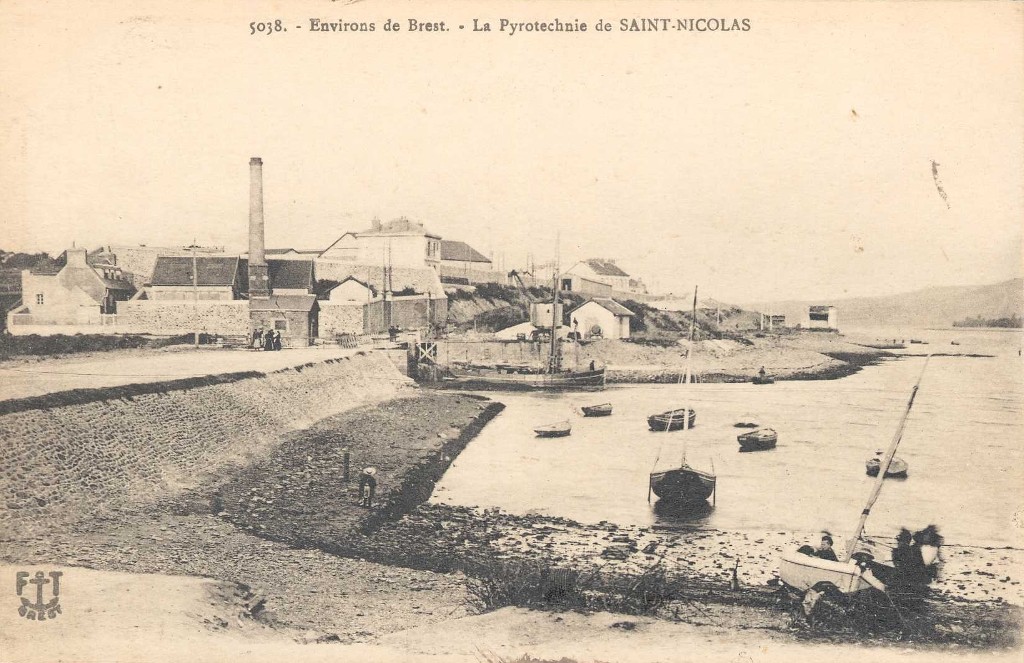 Vue de la digue de l'étang de Kerhuon faisant écluse et chaussée, carte postale (Éditions : F. [ancre marine] T. Brest ; légende : la pyrotechnie de Saint-Nicolas). Au centre, les bâtiments de la pyrotechnie (à gauche, bâtiment surmonté d'une cheminée)Immatriculation