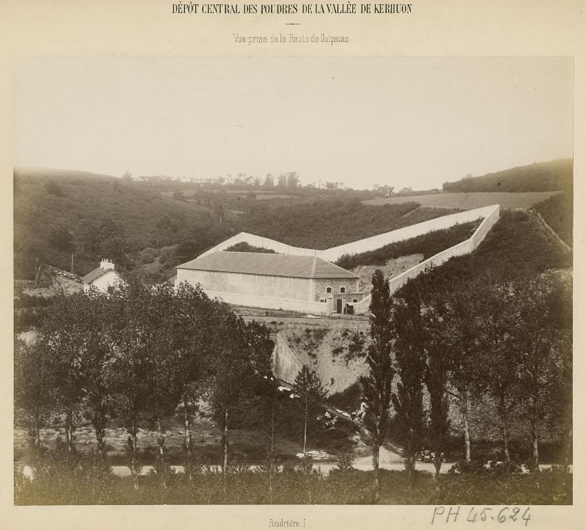 ATELIER PHOTOGRAPHIQUE DE L'ARSENAL DE BREST. Dépôt central des poudres de la vallée de Kerhuon. Vue prise de la route de Guipavas. Poudrière 1. 1885.
