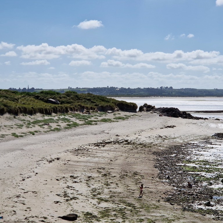 Vue de situation depuis l'est-nord-est : envahi par le sable, le bunker subit le mouvement des dunes. En arrière-plan, la grève de GoulvenImmatriculation