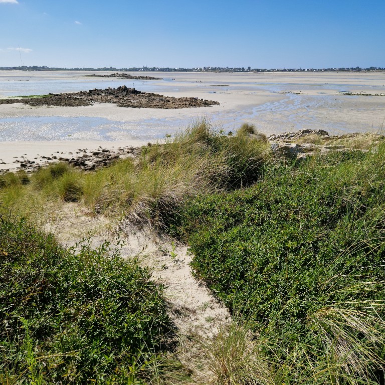 Vue générale de la pointe. Sous la végétation se cachent les vestiges d'une cuve pour canon antichar de 5 cm. En arrière-plan, la grève de Goulven à marée basseImmatriculation