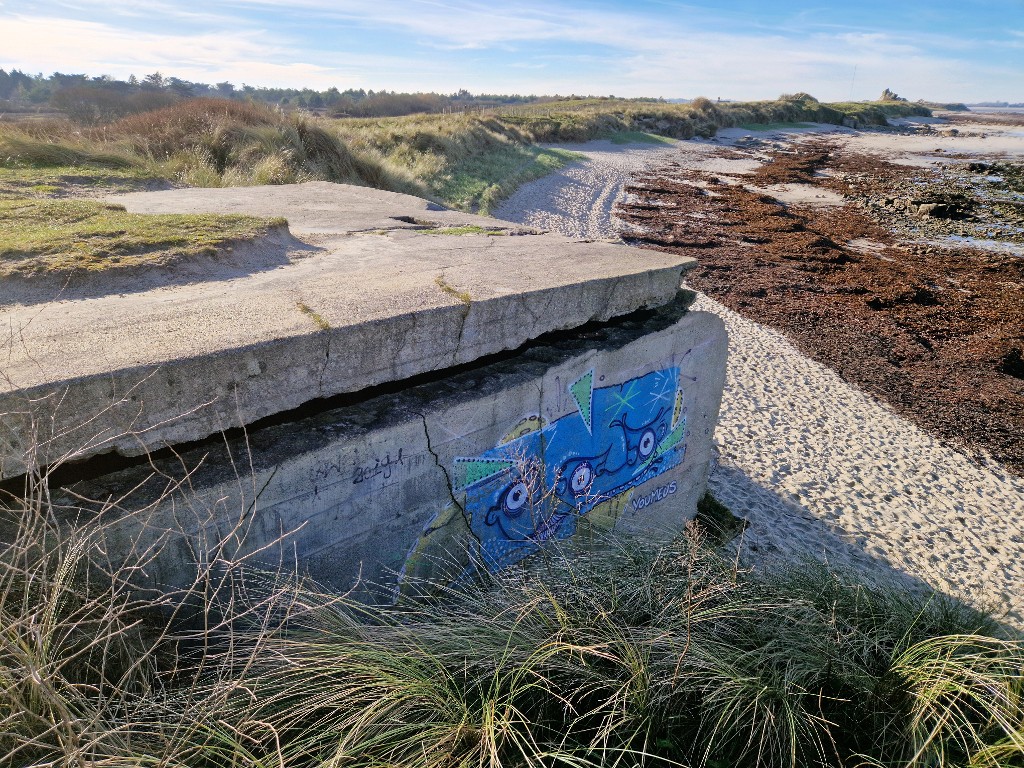 Vue de l'élévation nord. La dalle de couverture du bunker a vraisemblablement été soulevée par l'explosion du magasin aux munitions. En arrière-plan à droite, la grève de Goulven à marée basseImmatriculation
