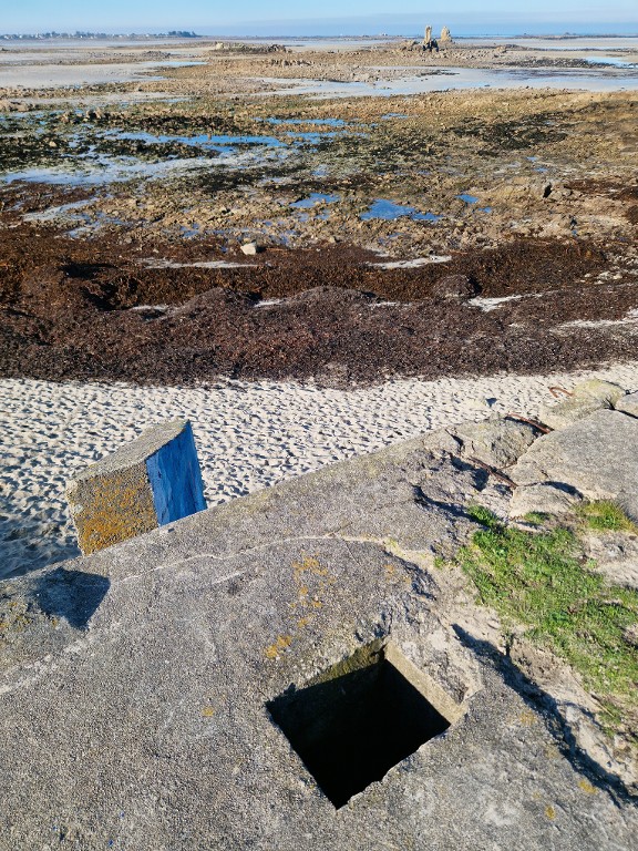 Vue générale vers le nord-ouest depuis la dalle de couverture. Au premier plan, l'orifice pour le périscope. En arrière-plan, la grève de Goulven à marée basseImmatriculation