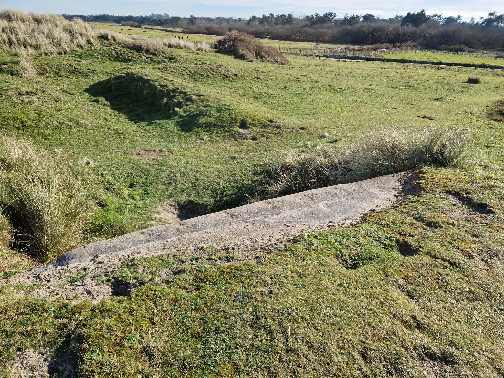 Vue générale vers l'ouest depuis la dalle de couverture. Au second plan, talus pour la mise en batterie du canonImmatriculation
