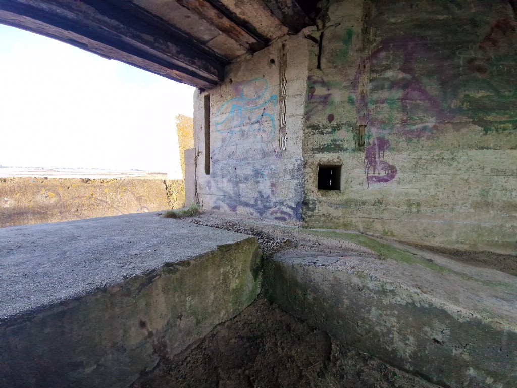 Vue intérieure : chambre de combat. Elle est reliée par une petite ouverture à la pièce servant dobservatoire avec puits de périscope. Rampes inclinées et rainures permettaient de faire monter puis de caler les roues de l'affût du canonImmatriculation