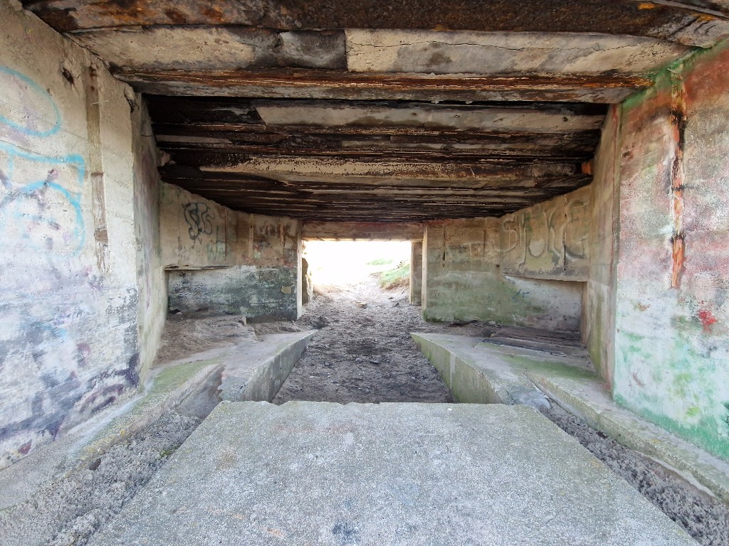 Vue intérieure : chambre de combat depuis l'embrasure ouest. Rampes inclinées et rainures permettaient de faire monter puis de caler les roues de l'affût du canonImmatriculation