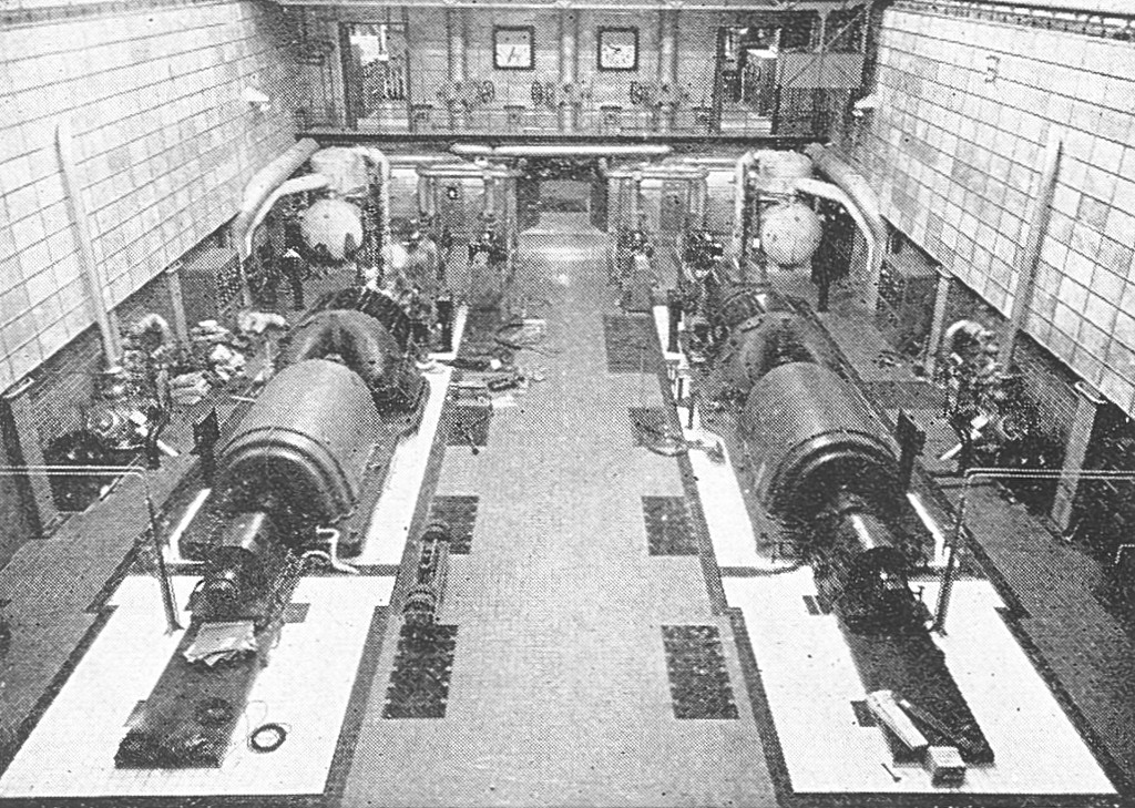 Vue de la salle des machines dans l'alvéole principale : ensemble de deux turbo-alternateurs, novembre 1953Immatriculation