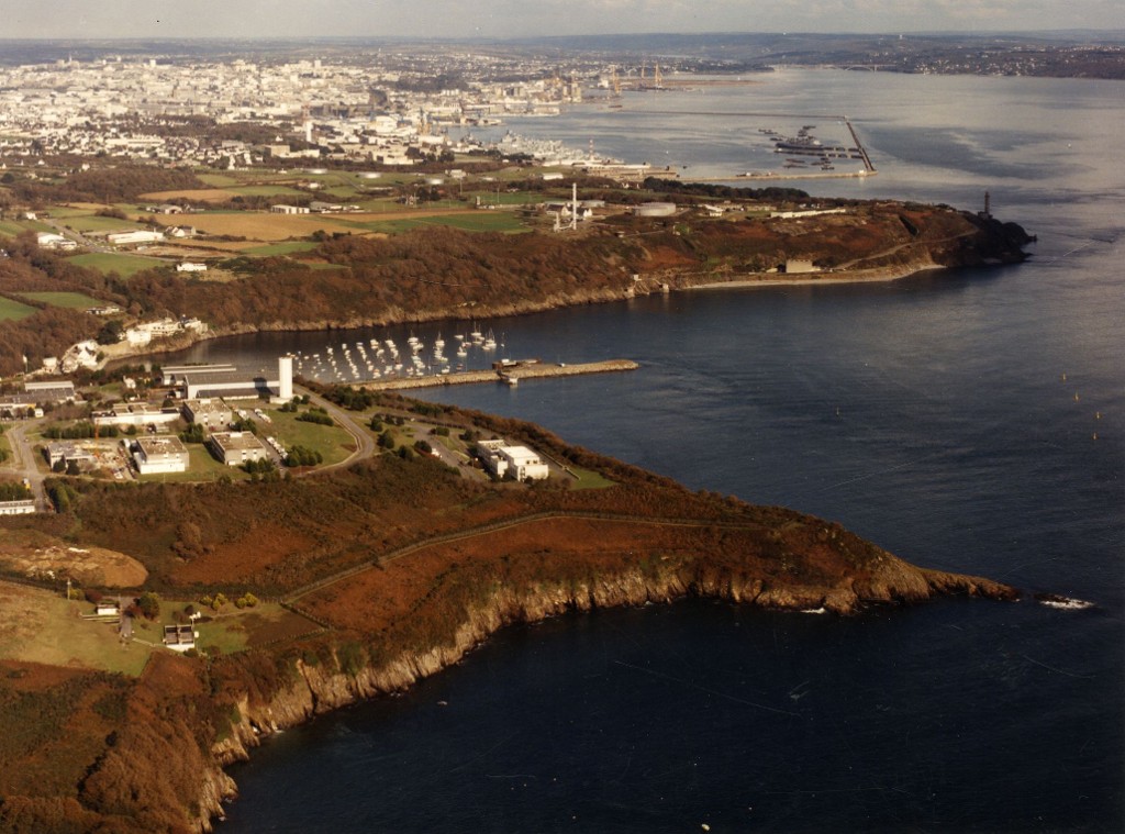 Vue aérienne oblique des pointes du Diable et du Portzic depuis l'ouest en 1988 (Archives municipales et communautaires de Brest : 13FI9218). Au premier plan : le site de l'Institut français de recherche pour l'exploitation de la merImmatriculation