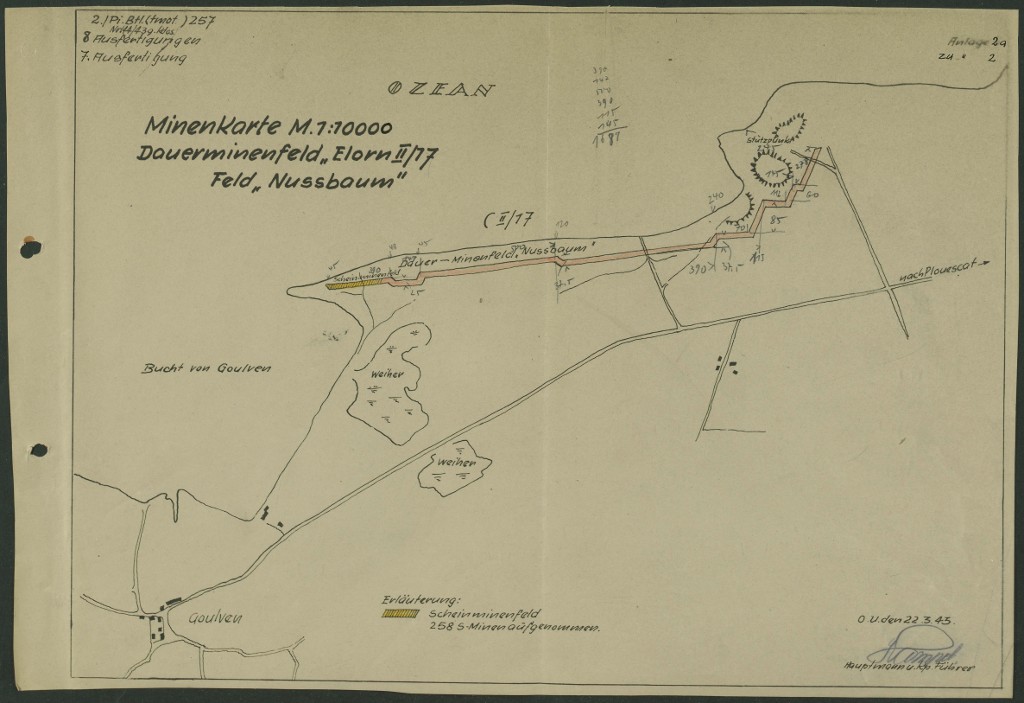 Dossier allemand de minage, commune de Tréflez, champ de mines Elorn II/17 : carte du champ de mines nommé Nussbaum (noyer), 22 mars 1943 [1538 engins de type S. Minen + 258 engins]-