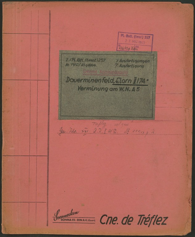 Dossier allemand de minage, commune de Tréflez, champ de mines permanent Elorn II/74 : pochette, 27 mars 1943-