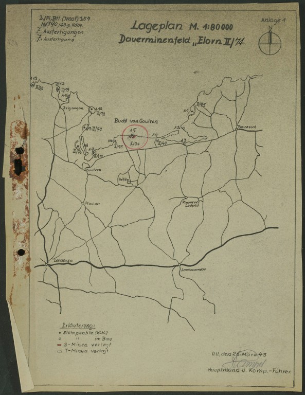 Dossier allemand de minage, commune de Tréflez, champ de mines permanent Elorn II/74 : plan de situation, 26 mars 1943. Cette carte figure les ensembles fortifiés côtiers-
