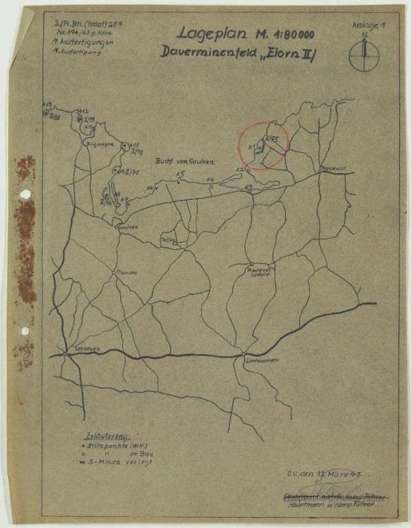 Dossier allemand de minage, commune de Plouescat, champ de mines permanent Elorn II/73 : plan de situation, 12 mars 1943. Cette carte figure les ensembles fortifiés côtiers-