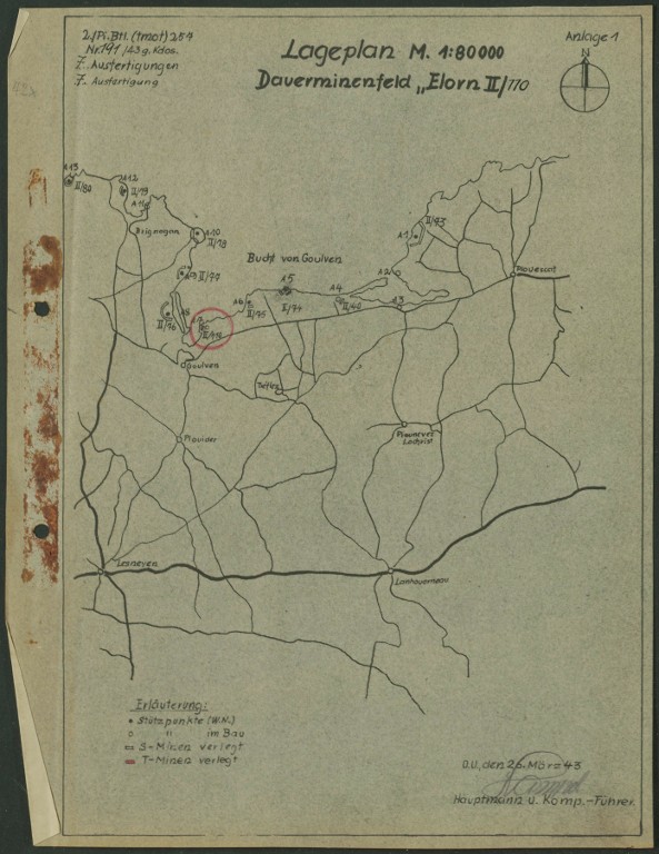 Dossier allemand de minage, commune de Tréflez, champ de mines permanent Elorn II/110 : plan de situation, 26 mars 1943Immatriculation